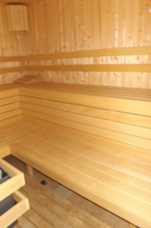 Downstairs, the entrance hall leads to an open-plan kitchen with dining table, cozy lounge in front of a fireplace and TV. There is also a shower/wc and private sauna downstairs. Opposite the front door, there is a tiled staircase leading to the 3 bedrooms on the top floor. There is a balcony and a fully fitted bathroom with bathtub and wc. It is ready for both personal use and letting.