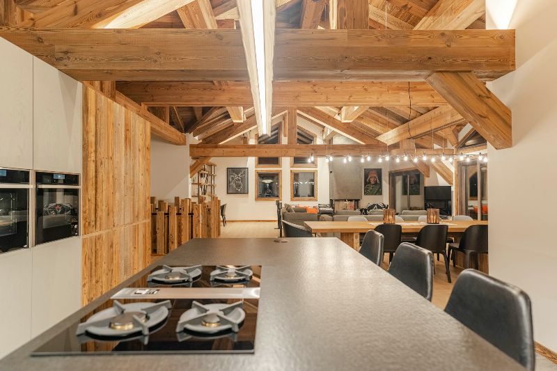 The kitchen is open on the living area with everything a chef dreams of: fridge/freezer, large ovens and hobs, wine cave, etc.