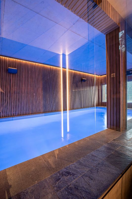 There is a terrace with a hot tub, and inside the chalet, there is a private indoor swimming pool. There is also a large balcony with a table and seating to enjoy the views on warmer days on the top floor of the chalet.